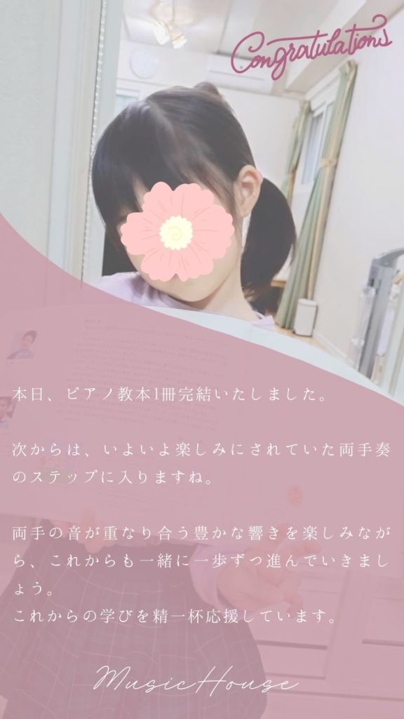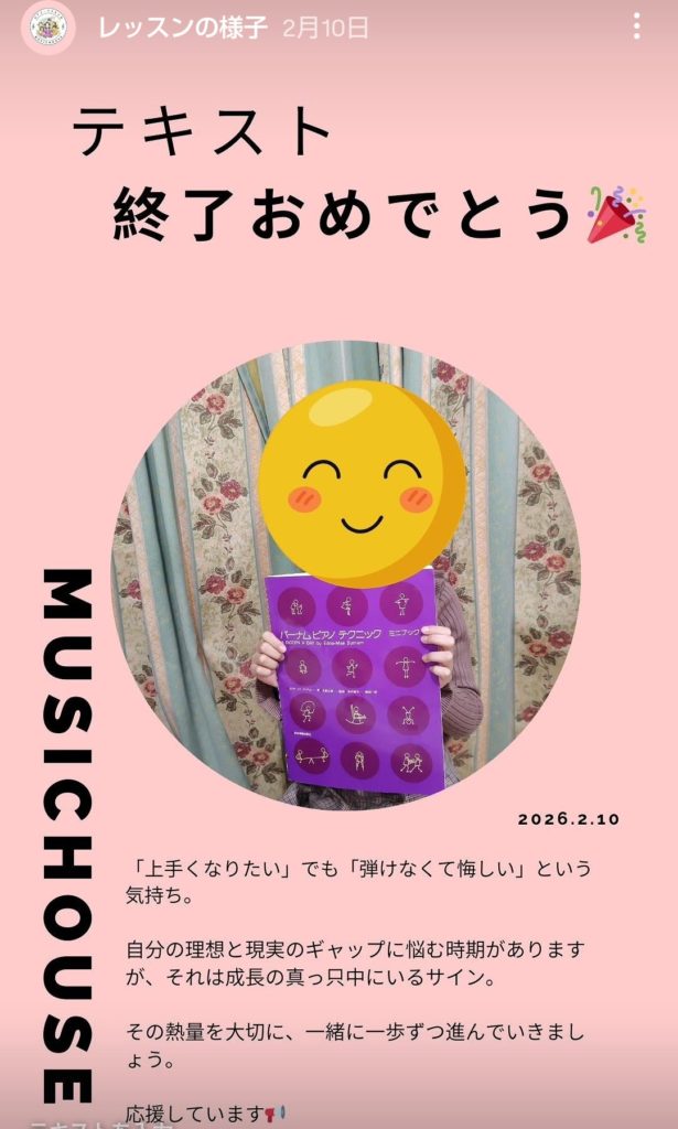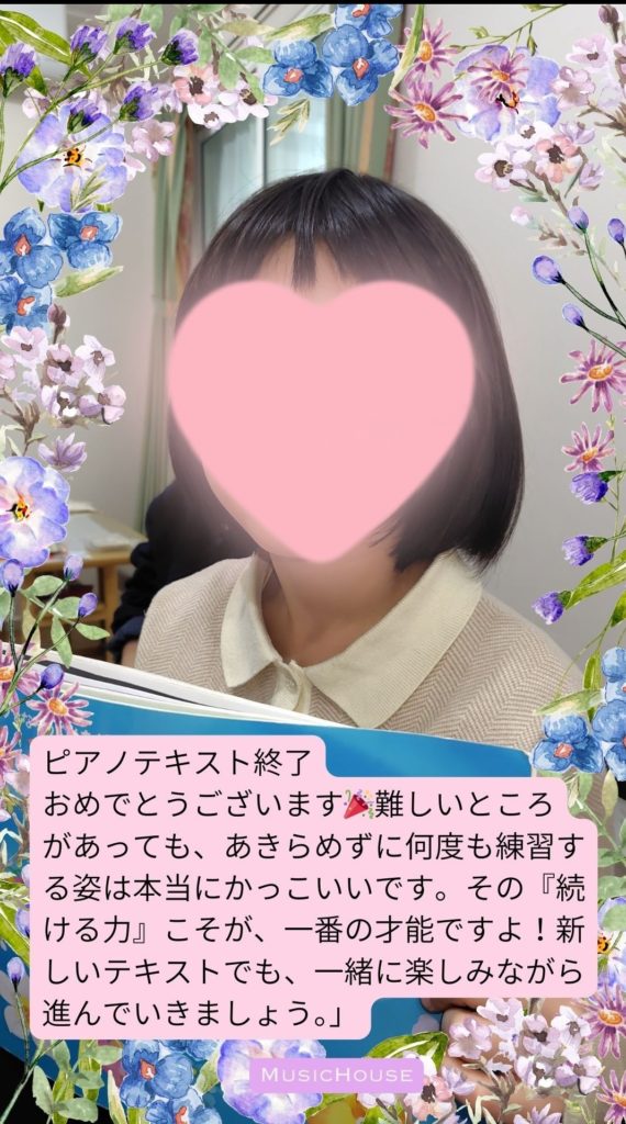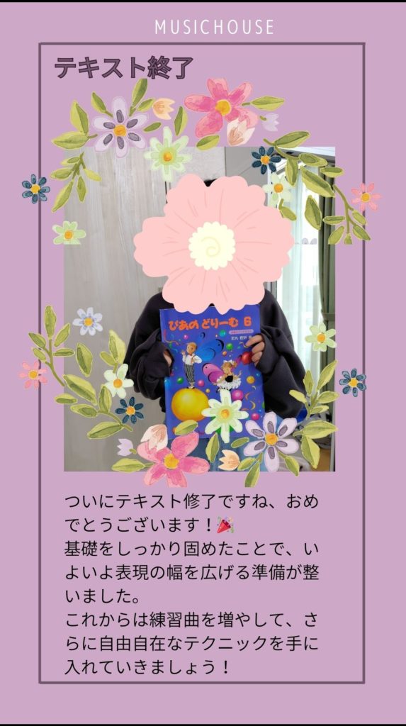 ​毎日の練習の中には、なかなか上手くいかなくて立ち止まってしまう日もあったはずです。それでも諦めずにコツコツと積み重ねた努力が、こうして「テキスト終了」という素晴らしい形になりました。